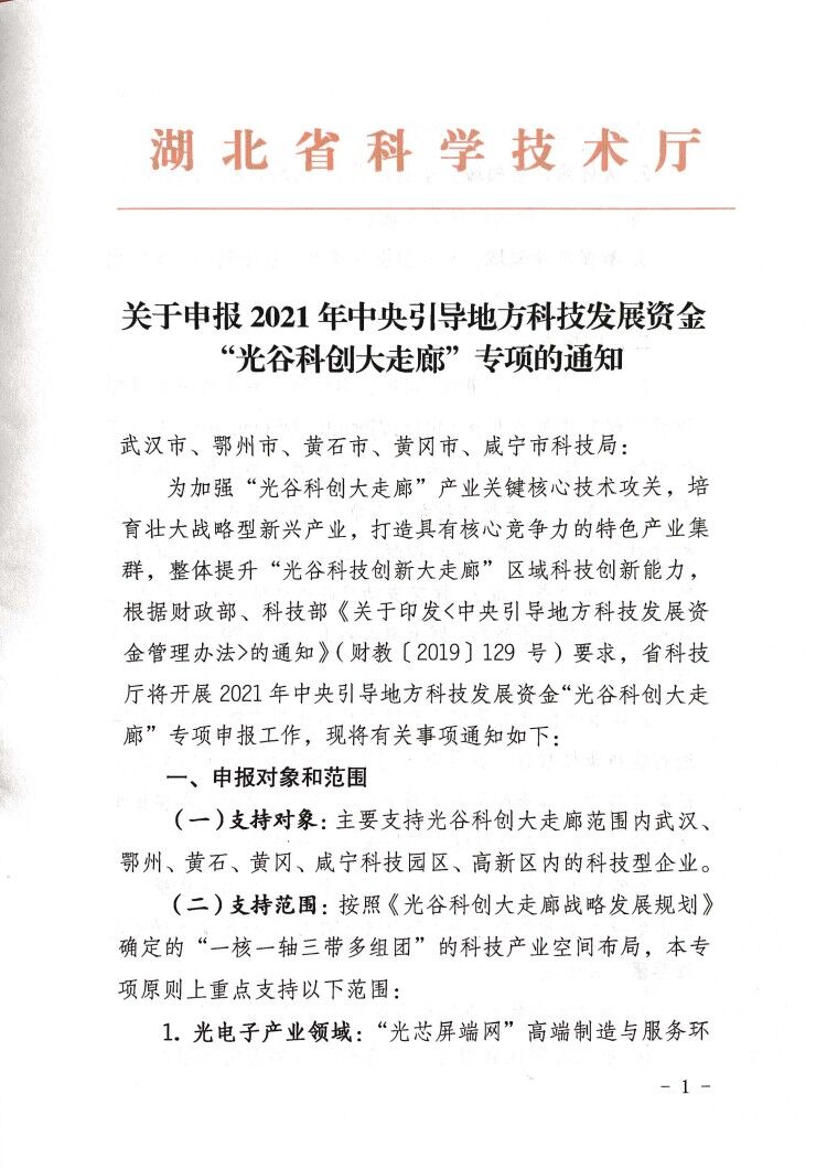 關(guān)于申報(bào)2021年中央引導(dǎo)地方科技發(fā)展資金“光谷科技創(chuàng)大走廊”專項(xiàng)的通知